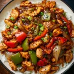 A flavor-packed dish featuring succulent chicken, sautéed vegetables, and a bold black pepper sauce.