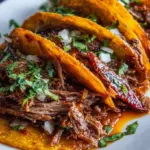 Tender, slow-cooked beef enveloped in savory sauce, served in crispy corn tortillas, perfect for family gatherings.