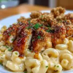A comforting dish of golden-brown honey-glazed chicken paired with creamy mac & cheese, perfect for family gatherings and casual meals.