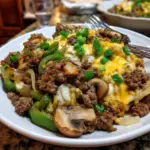 Next, add the sliced onion, green bell pepper, and mushrooms to the skillet. Sauté them until they’re softened, about 5-7 minutes. This step adds a wonderful texture and flavor to the dish. The veggies will soak up all that delicious beefy goodness!