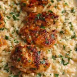 A comforting one-pan meal featuring tender chicken, creamy Parmesan sauce, and perfectly cooked rice, perfect for family gatherings or cozy dinners.