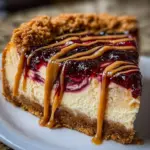 You’ll love cutting into the cheesecake, revealing the colorful swirls, and watching eyes light up as you serve it. It’s both visually stunning and deliciously mouthwatering, ensuring no leftovers will remain. The way the fruity jam intertwines with the smooth creaminess of peanut butter sends your taste buds on a nostalgic journey, while the graham cracker crust adds a satisfying crunch.