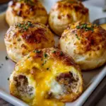 Delicious breakfast bombs filled with scrambled eggs, gooey cheddar cheese, and savory bacon or sausage, all wrapped in a golden biscuit shell.